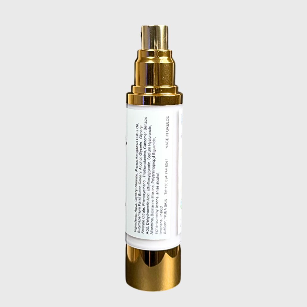 Ingredients: Aqua, Isopropyl Myristate, Glyceryl Stearate, Prunus Amygdalus Dulcis Oil, Butyrospermum Parkii Butter, Cetearyl Alcohol, Glycerin, Glyceryl Stearate Citrate, Phenoxyethano., Triethanolamine, Carbomer, Benzoic Acid, Disodium Edta, Bht, Dehydroacetic Acid, Ethylhexylglycerin, Sodium Hyaluronate, Allantoine, Biomarine Elastine, Polyaminopropyl Biguanide, Fragrance
