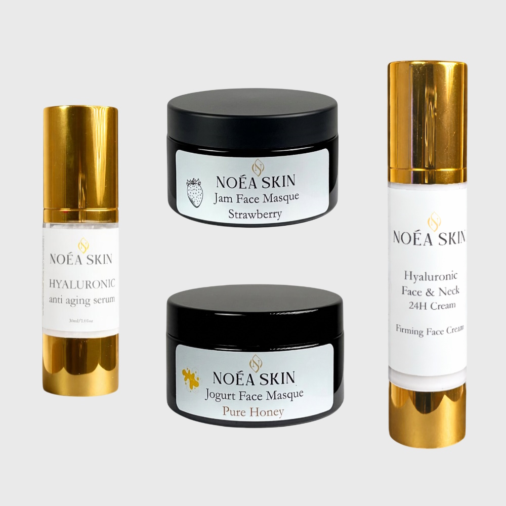 Beauty package with hyaluronic serum face cream and two masks.